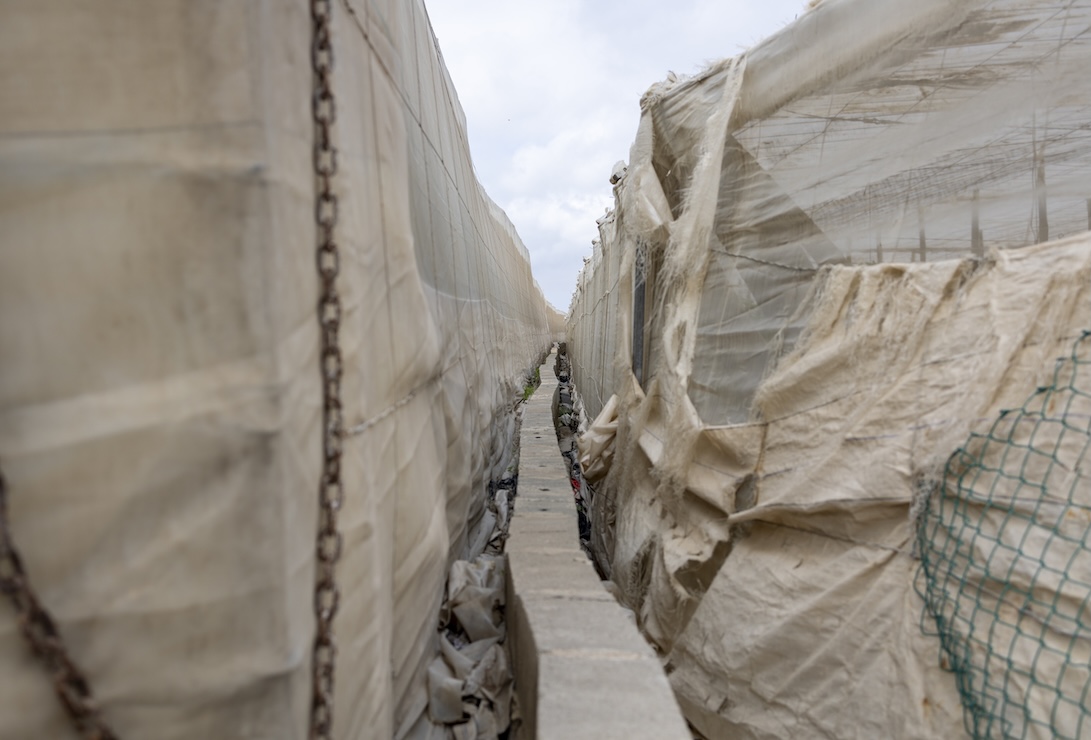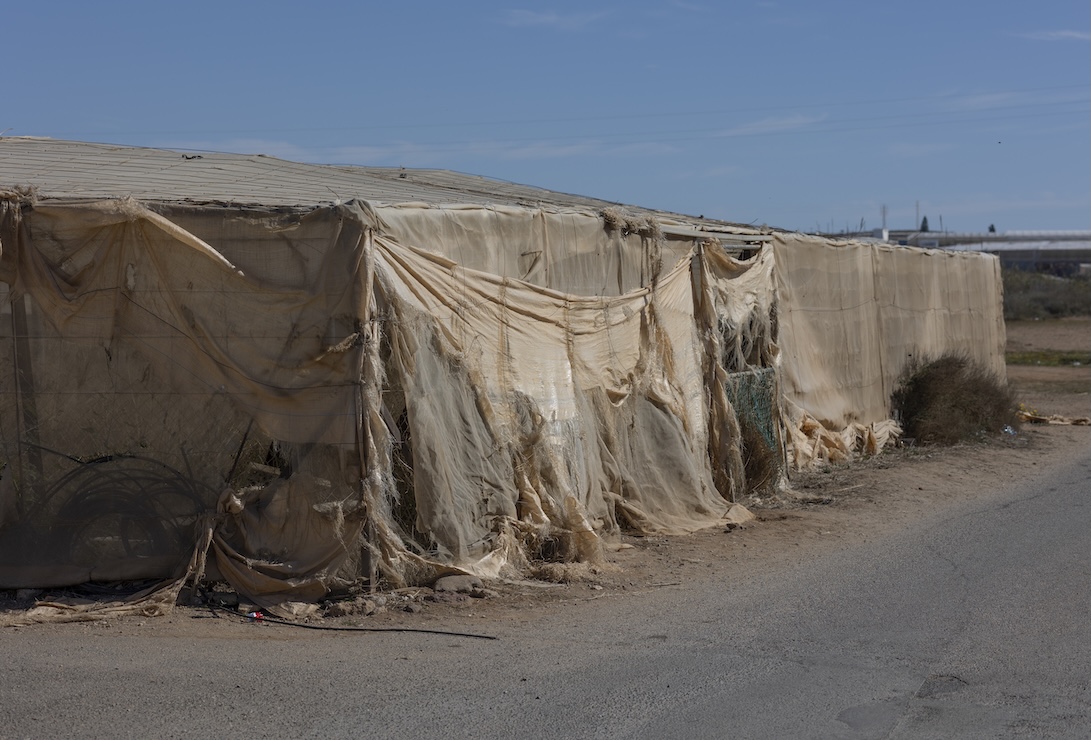 At first glance the greenhouses appear uniform, bright, and controlled. Vast sheets of plastic stretch across the landscape, signalling abundance and order. Hidden beneath are exhausted aquifers, chemical residues, discarded plastics, and an often abused workforce kept largely out of sight. The apparent efficiency of the system conceals deep environmental strain and persistent social exploitation.