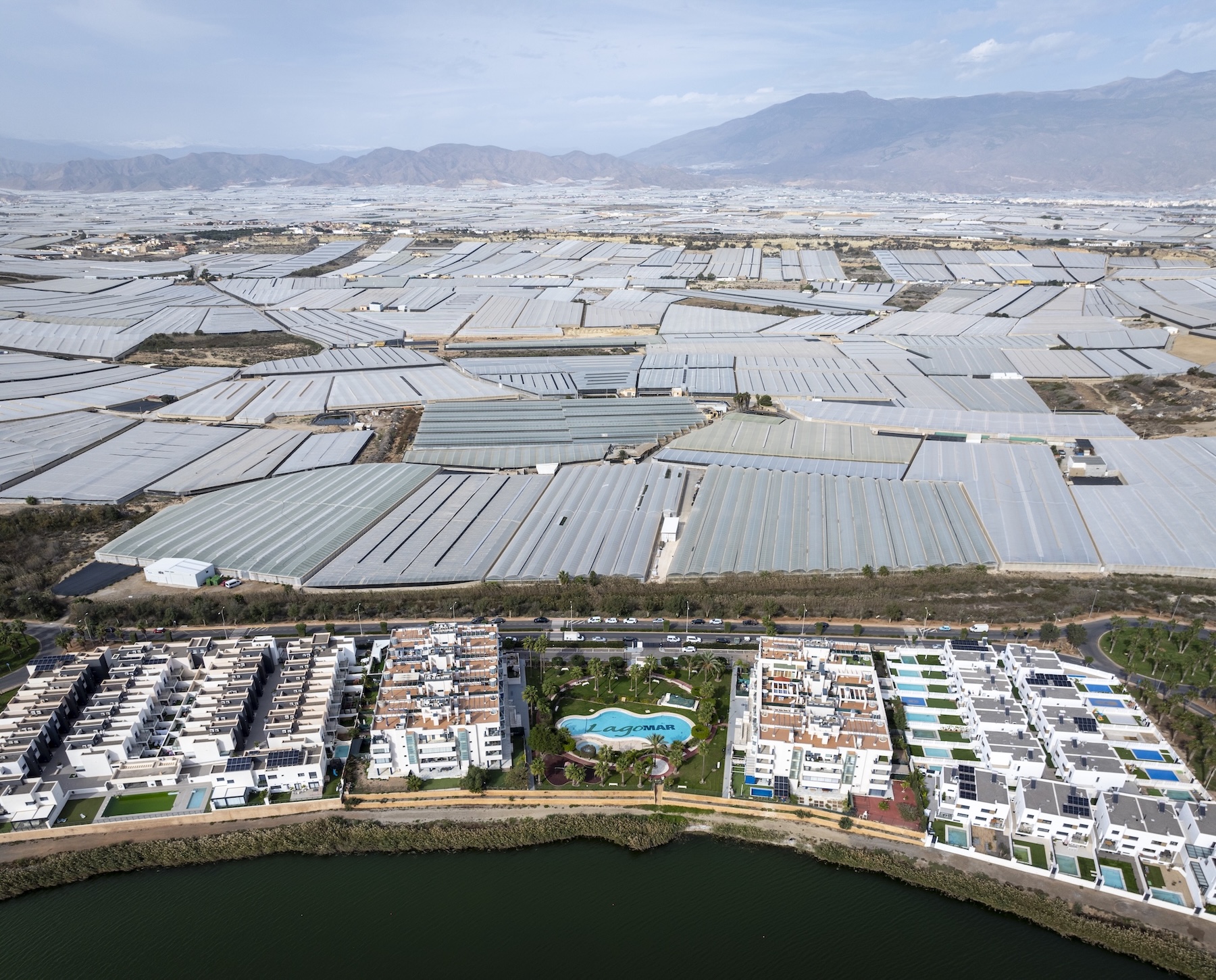 The luxury resort of Almerimar juxtaposed by nearby greenhouses - a visual metaphor for the ubiquitous inequality here